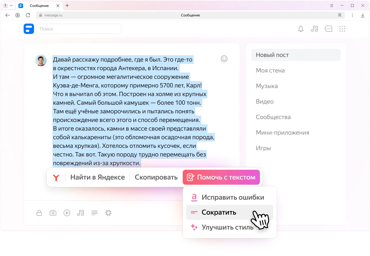 - "Облачные" возможности: поиск с подсказками, проверка орфографии, переводчик, геолокация и другие сервисы Яндекса.