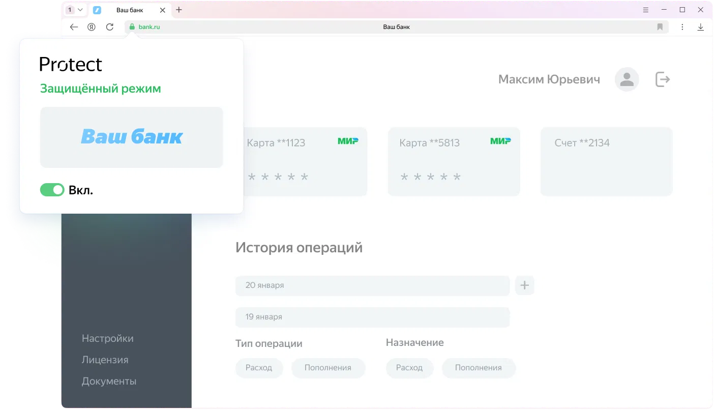 Защищенный режим включается автоматически при открытии страниц интернет-банкинга и платежных систем. В этом режиме отключаются все дополнения, кроме проверенных Яндексом менеджеров паролей, и включается строгий режим проверки сертификатов HTTPS. Защищенный режим доступен только в новом интерфейсе Калипсо.